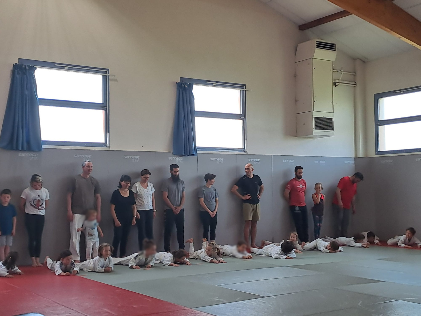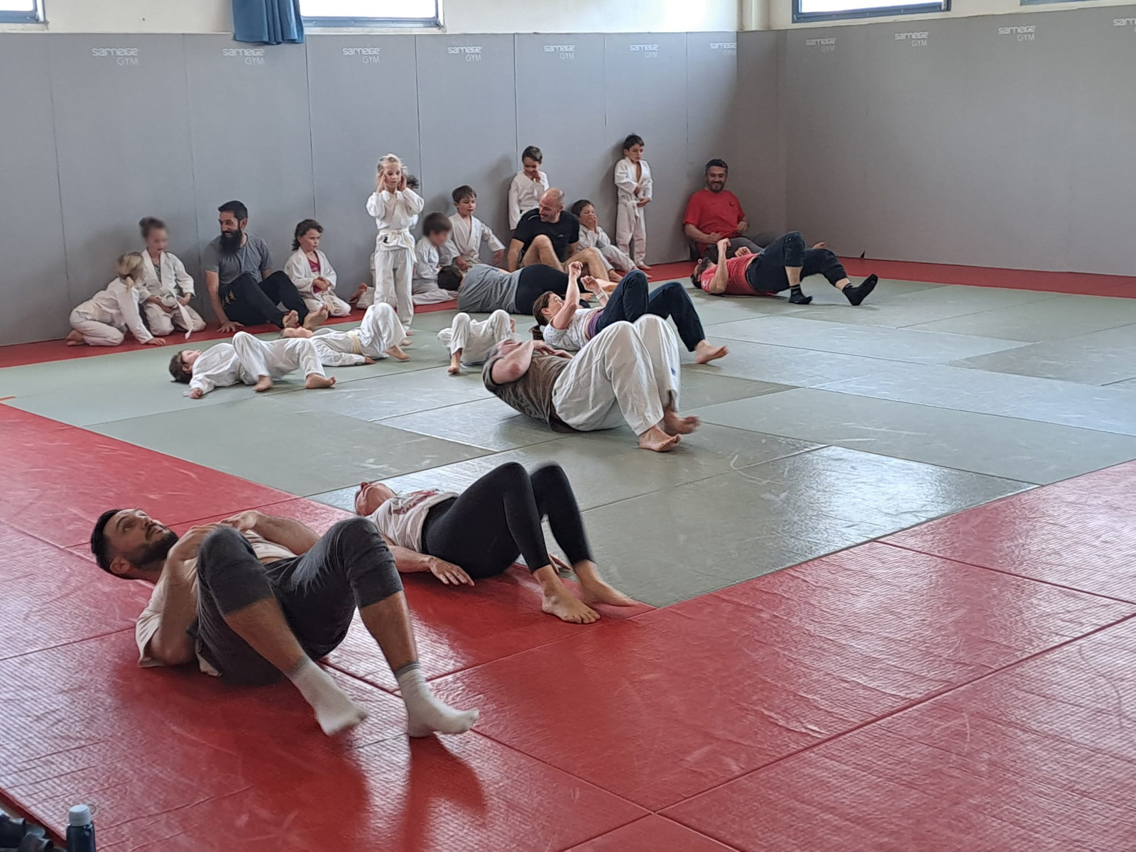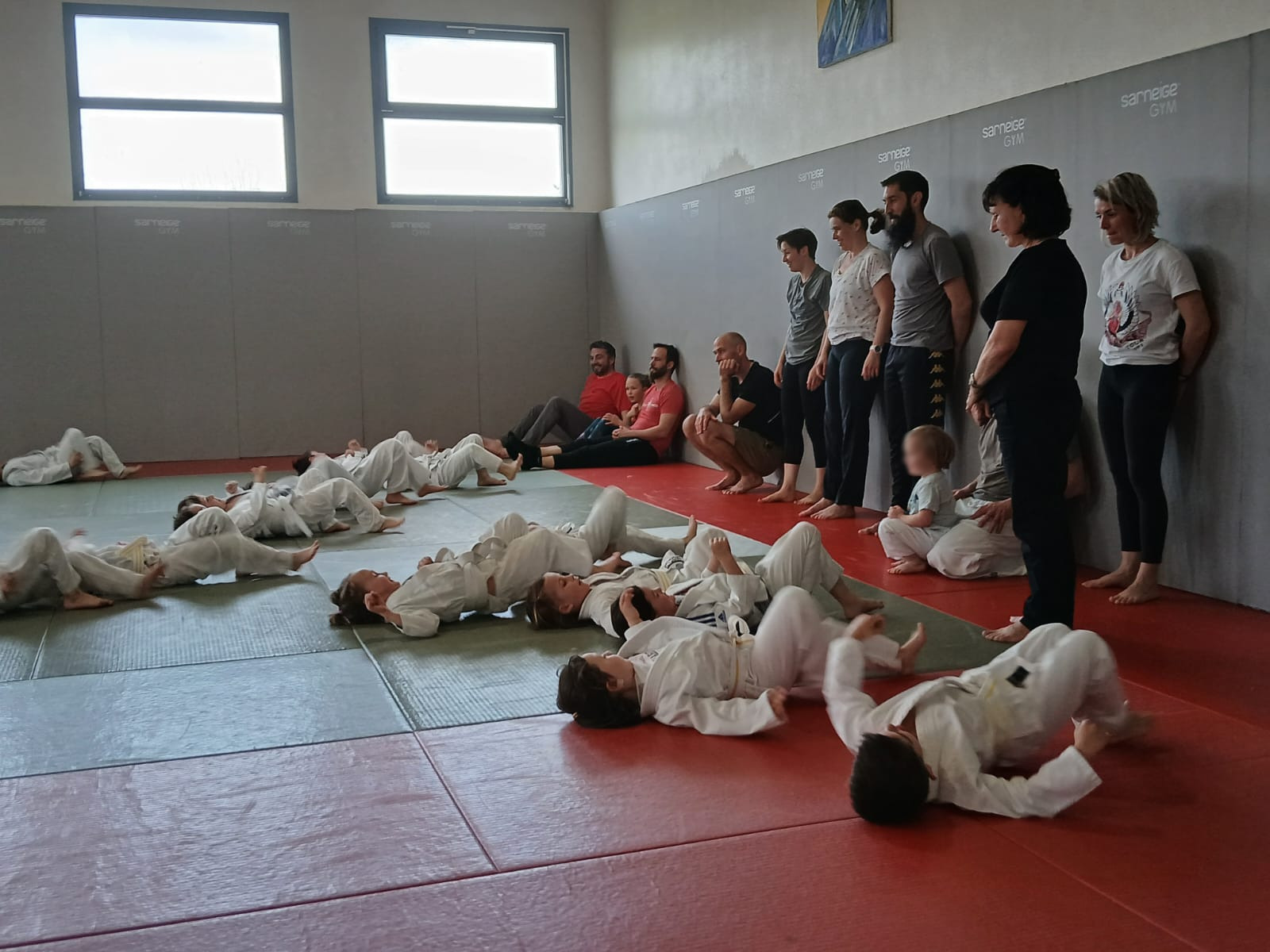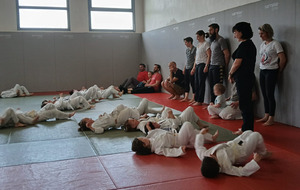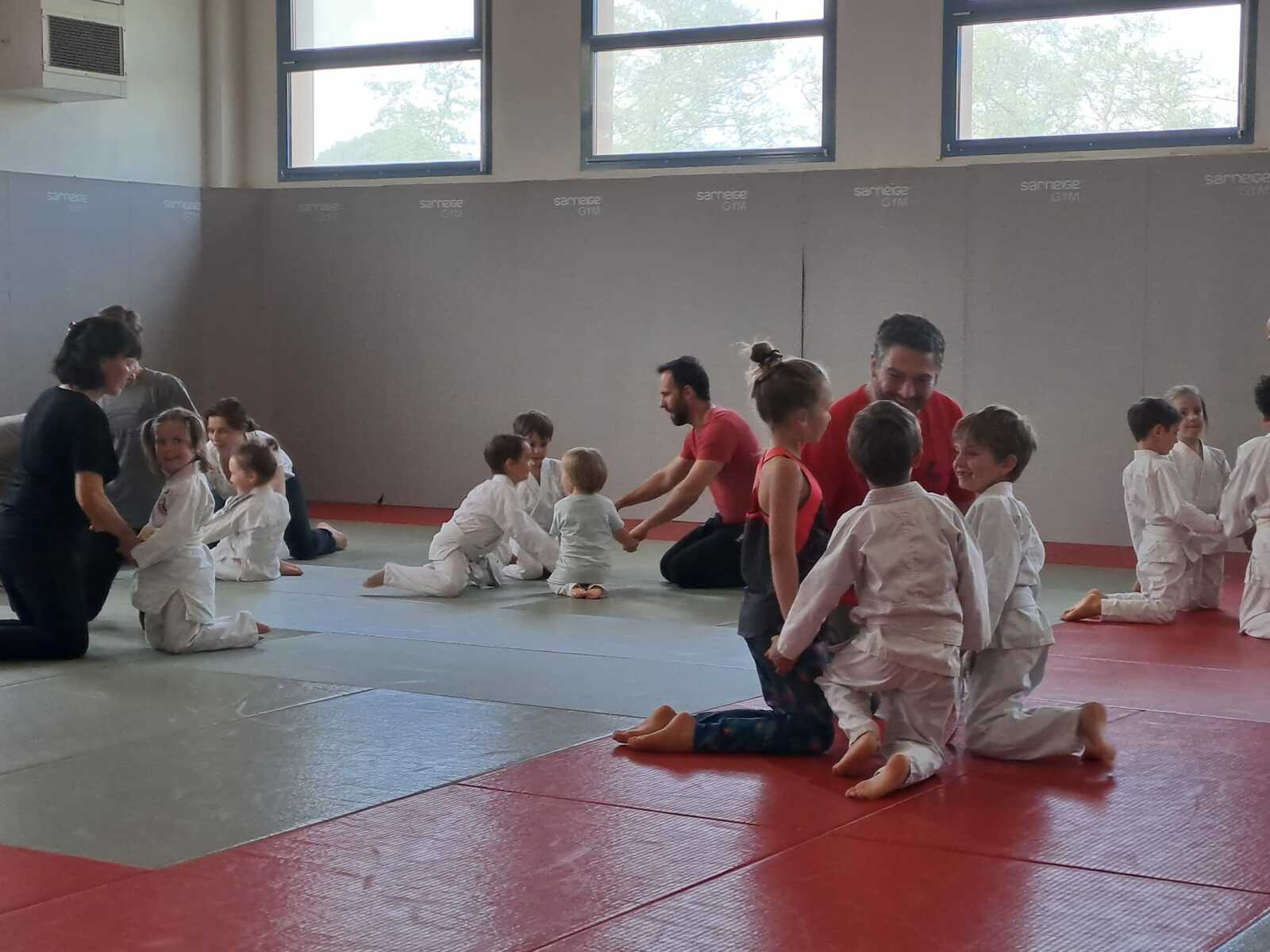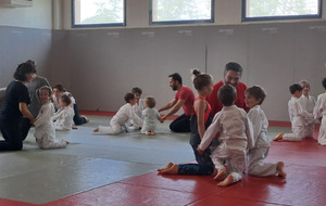 Les baby 2 (né(e)s en 2019) ont invité leurs parents, frères et sœurs sur le tatami. L'occasion pour les néophytes d'apprendre les rudiments de la chute arrière, les déplacements au sol ainsi que les retournements et les immobilisations grâce aux explications d'Arielle. Le tout agrémenté de jeux et de bonne humeur.