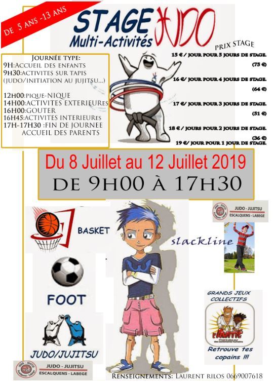 Le club propose un stage multi-activités du 08 au 12 juillet 2019 de 09h00 à 17h30. Le stage s'adresse aux enfants de 5 à 13 ans.
